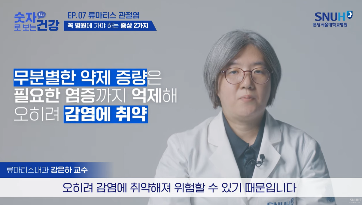 염증을 억제하겠다고 무분별하게 약제를 증량할 경우에는 몸을 지키기 위해서 꼭 필요한 자연스러운 염증까지 억제해서 오히려 감염에 취약해져 위험할 수가 있기 때문이라고 합니다
